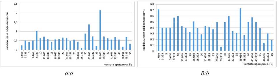Рис. 7. Изменение коэффициента эффективности от частоты вращения ротора ЭМУ с макетом № 2 (а) по направлению X (Y), (б) по направлению Z
