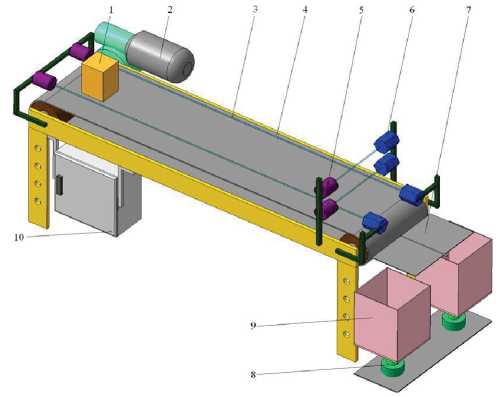 Физическая модель включает в себя: 1 – транспортируемый груз; 2 – электродвигатель асинхронный; 3 – инфракрасный луч; 4 – ленту; 5 – источники света; 6 – оптические датчики; 7 – направляющую поворотную площадку для спуска грузов в корзины; 8 – датчики измерения веса грузов; 9 – приёмные корзины для сбора грузов; 10 – силовой шкаф с электрооборудованием.