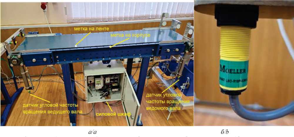 Рис. 2. а) ленточный транспортер, блок управления, датчики и метки; б) оптоэлектронный датчик