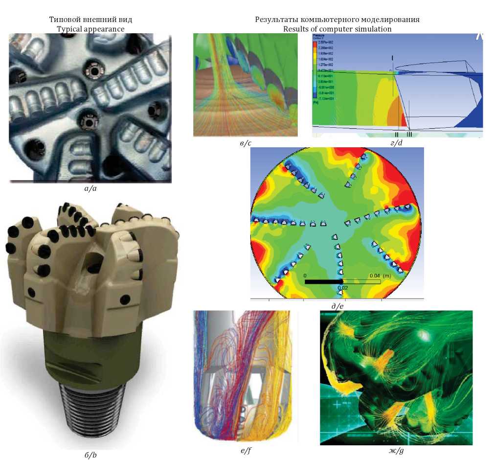 Рис. 1. Анализ типовых долот PDC: а) конструкция рабочего торца долота Smith Bits; б) общий вид; результаты компьютерного моделирования: в) линии тока в пределах рабочего ряда резцов [24]; г) давление жидкой среды под рабочей поверхностью PDC; д) гидравлическое давление на торце (красным обозначено максимальное значение) [27, 28]; е, ж) линии тока в процессе бурения скважины [26–28]