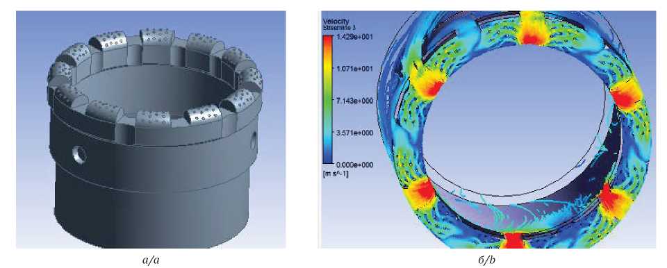 Рис. 4. Алмазная буровая коронка с развитой промывочной системой [29]: а) трехмерная модель; б) результаты моделирования гидродинамических процессов