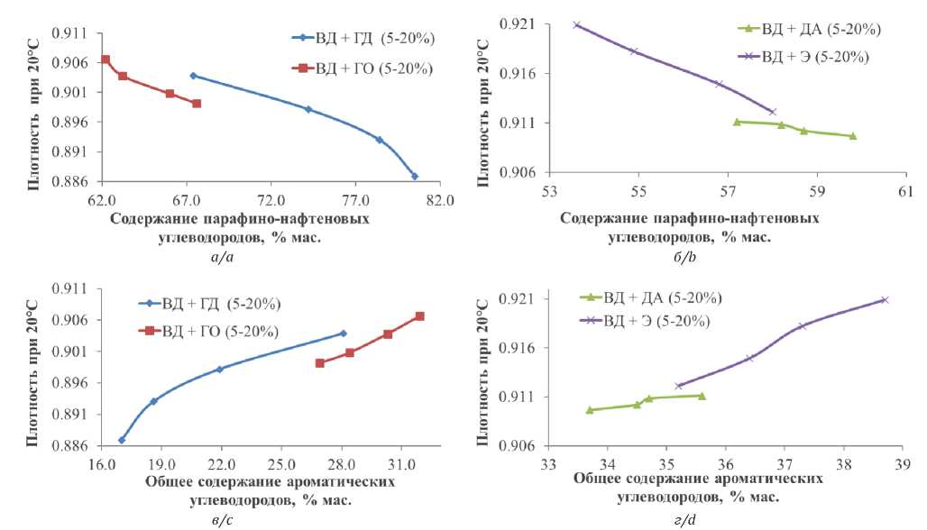 При смешении нефтепродуктов, существенно различающихся по плотности, имеется возможность проявления эффекта «потери объема при смешении» [1, 14–19]. Изменения плотностей смесевого сырья, содержащего 5–20 мас. % гачей дистиллятных и остаточных, деасфальтизата и экстракта в вакуумном дистилляте в зависимости от содержания в смеси парафино-нафтеновых и ароматических углеводородов, приведены на рис. 1, а–г.