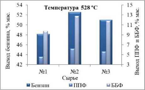 При крекинге Сырья № 3 выход бензина составил 51,02 мас. %, что на 1,53 мас. % ниже по сравнению с Сырьем № 2 (рис. 4, а), и это связано с уменьшением содержания насыщенных веществ в составе сырья. Хотя выход бензина снизился, ОЧи увеличилось на 2,27 ед. (с 89,5 до 91,7 ед.) благодаря возросшему содержанию ароматических соединений в составе Сырья № 3. Выход ББФ составил 11,8 мас. % (рис. 4, б), в переводе на т/сут это 486,2 т/сут и 5,6 мас. %, что соответствует выходу ППФ 231,3 т/сут (рис. 4, в) при постоянной температуре крекинга 528 °С. Массовые расходы продуктов приведены в табл. 2.