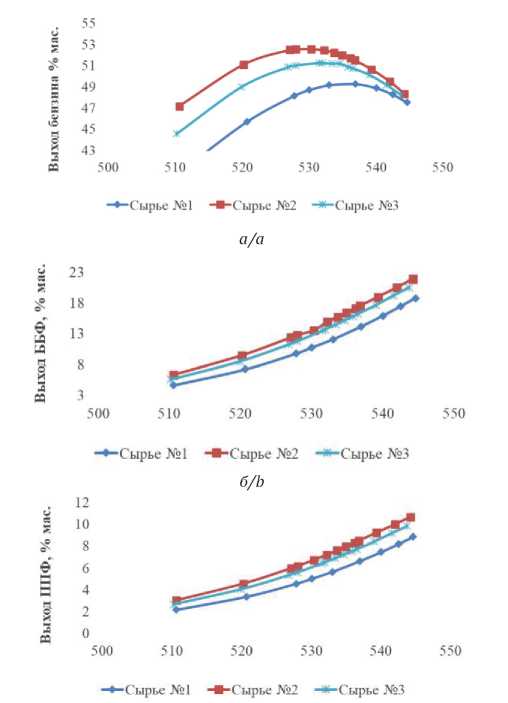 Рис. 4. Результаты влияния температуры крекинга на выход: а) бензина; б) ББФ; в) ППФ