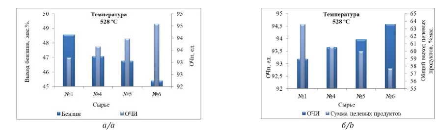 Применение модели показало, что при переработке Сырья № 1 обеспечивается производство максимального выхода бензина, ППФ и БФФ, что соответствует 48,56, 4,79 и 10,23 мас. %, соответственно (рис. 5, а, б), что связано с более высоким содержанием в нем насыщенных углеводородов, при этом ОЧи бензина ниже относительно других типов сырья (93,19 ед.), что можно объяснить наименьшим содержанием ароматических углеводородов по сравнению с Сырьем № 2, 3. По мере увеличения количества экстракта в смесевом Сырье № 4–6 наблюдается снижение выхода бензина (47,08, 46,76 и 45,41 мас. %), ППФ (4,28, 4,2 и 3,88 мас. %) и ББФ (9,18, 9,02 и 8,38 мас. %) вследствие более высокой ароматичности вовлекаемого потока. При этом с увеличением ароматических соединений возрастает ОЧи (93,6, 93,9 и 94,6 ед.), соответственно.