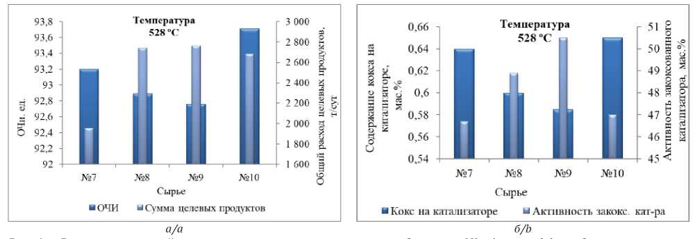 Рис. 6. Влияние изменений в составе сырья на сумму целевых продуктов и ОЧи бензина (а) и содержание кокса и активность катализатора (б)