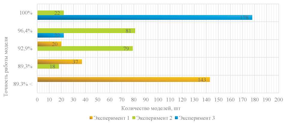 Более того, необходимо аккуратно подходить к вопросу выбора подходящей метрики для проверки точности модели, поскольку разные метрики имеют разные целевые характеристики для сравнения, что может определенным образом исказить конечные результаты. Графическое представление точности обученных моделей и их количества для каждого из экспериментов можно увидеть на рис. 5, где точность оценивалась с использованием метрики Accuracy_score, и на рис. 6, где точность оценивалась с использованием специальной метрики.