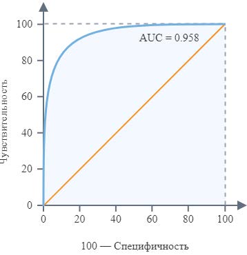 На рис. 1 площадь под кривой (синяя линия) является мерой способности классификатора различать классы. Чем ближе значение площади к единице, тем лучше модель.