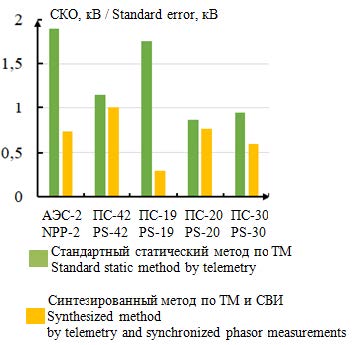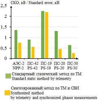 Среднее значение СКО напряжения в нормальном режиме при использовании статического метода ОС по ТМ составляет 1,29 кВ, а при применении синтезированного метода ОС по ТМ и СВИ – 0,84 кВ. В послеаварийном режиме среднее значение СКО для статического метода ОС по ТМ – 2,46 кВ, а для синтезированного метода по ТМ и СВИ – 0,68 кВ.