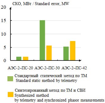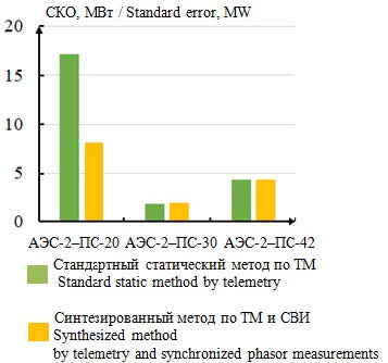 При оценивании перетоков активной мощности среднее значение СКО в нормальном режиме при использовании статического метода ОС по ТМ составляет 7,78 МВт, а при применении синтезированного метода ОС по ТМ и СВИ – 4,80 МВт. В послеаварийном режиме среднее значение СКО для статического метода ОС по ТМ – 7,25 МВт, для синтезированного метода по ТМ и СВИ – 4,87 МВт.