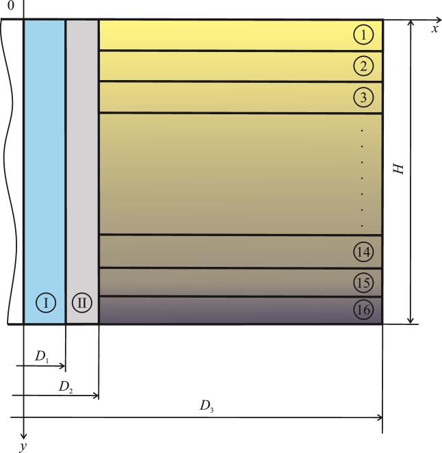 Рис. 1. Схема области решения: I – трубопровод; II – цементные колонны, кондуктор и направления; 1–16 – слои породы/грунта (табл. 1)