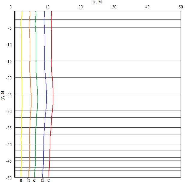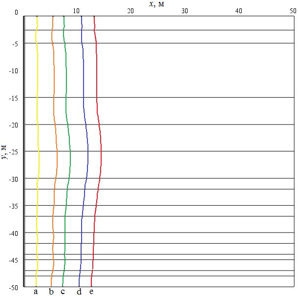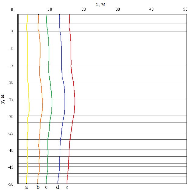 Рис. 5. Изотермические линии 273,15 К в рассматриваемой области решения при Т1=298,15 К: a) 1 год; b) 5 лет; с) 10 лет; d) 20 лет; e) 30 лет