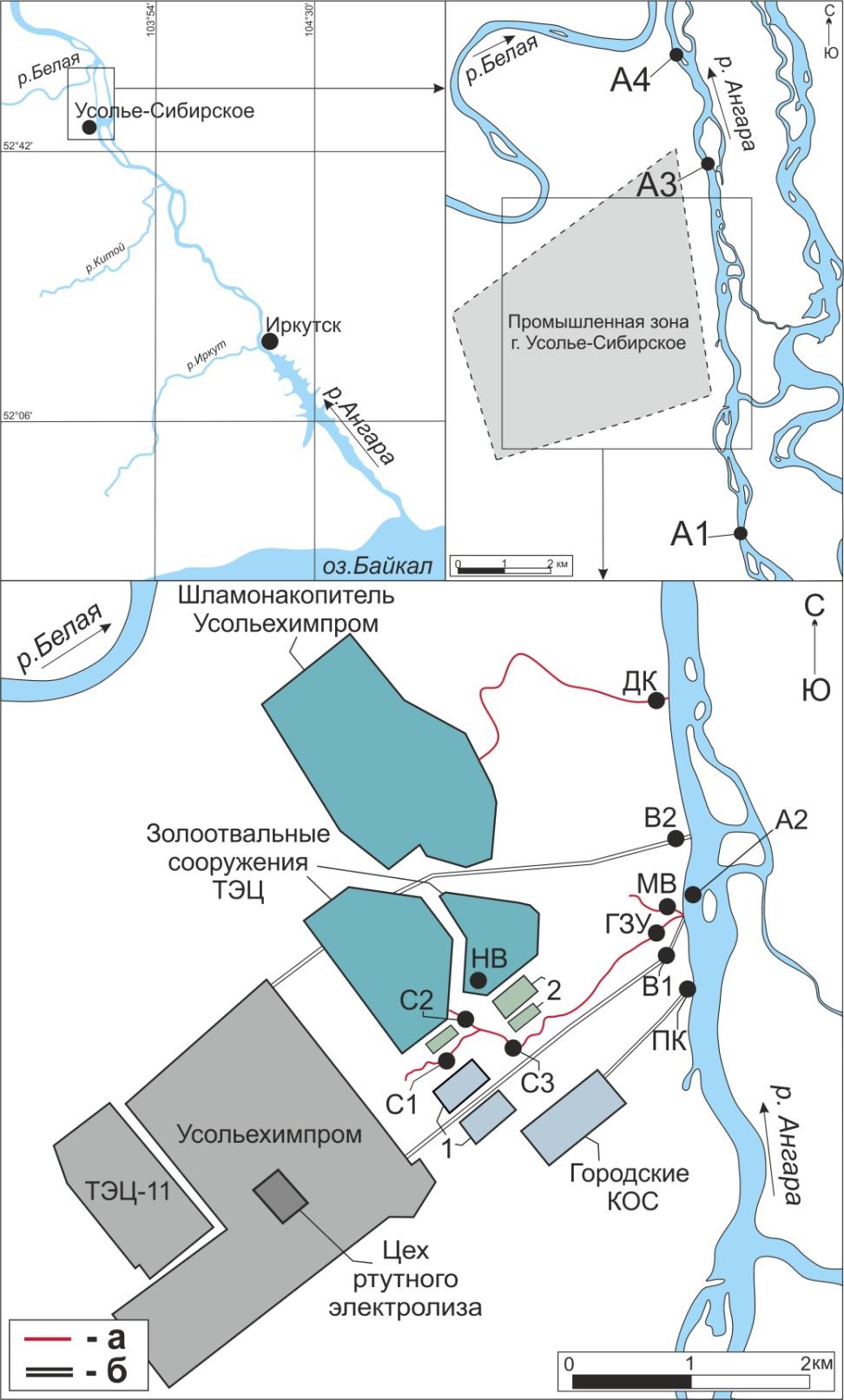 Рис. 1. Карта-схема района работ и точки отбора проб: а) сточные воды, поступающие в р. Ангару по поверхности; б) коллекторные выпуски сточных вод; 1 – канализационно-очистные сооружения Усольехимпром; 2 – станции нейтрализации жидких стоков Усольехимпром; точки отбора: сточные воды: ПК – приемная камера городских стоков, В1, В2, ДК – организованные выпуски Усольехимпром; С1, С2, МВ – водотоки, наполняющие канаву гидрозолоудаления; С3 и ГЗУ – канава гидрозолоудаления; НВ – надшламовые воды золоотвальных сооружений ТЭЦ-11; р. Ангара: А1 – фоновый участок р. Ангары; А2 – участок р. Ангары на удаленности 50 м от выпуска канавы гидрозолоудаления; А3 – участок на удаленности 1,5 км от всех промышленных выпусков; А4 – участок на удаленности 5 км от всех промышленных выпусков