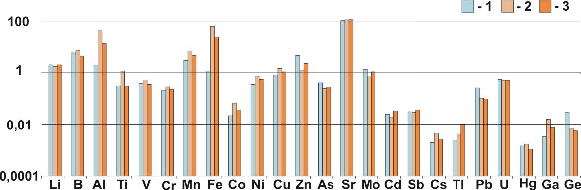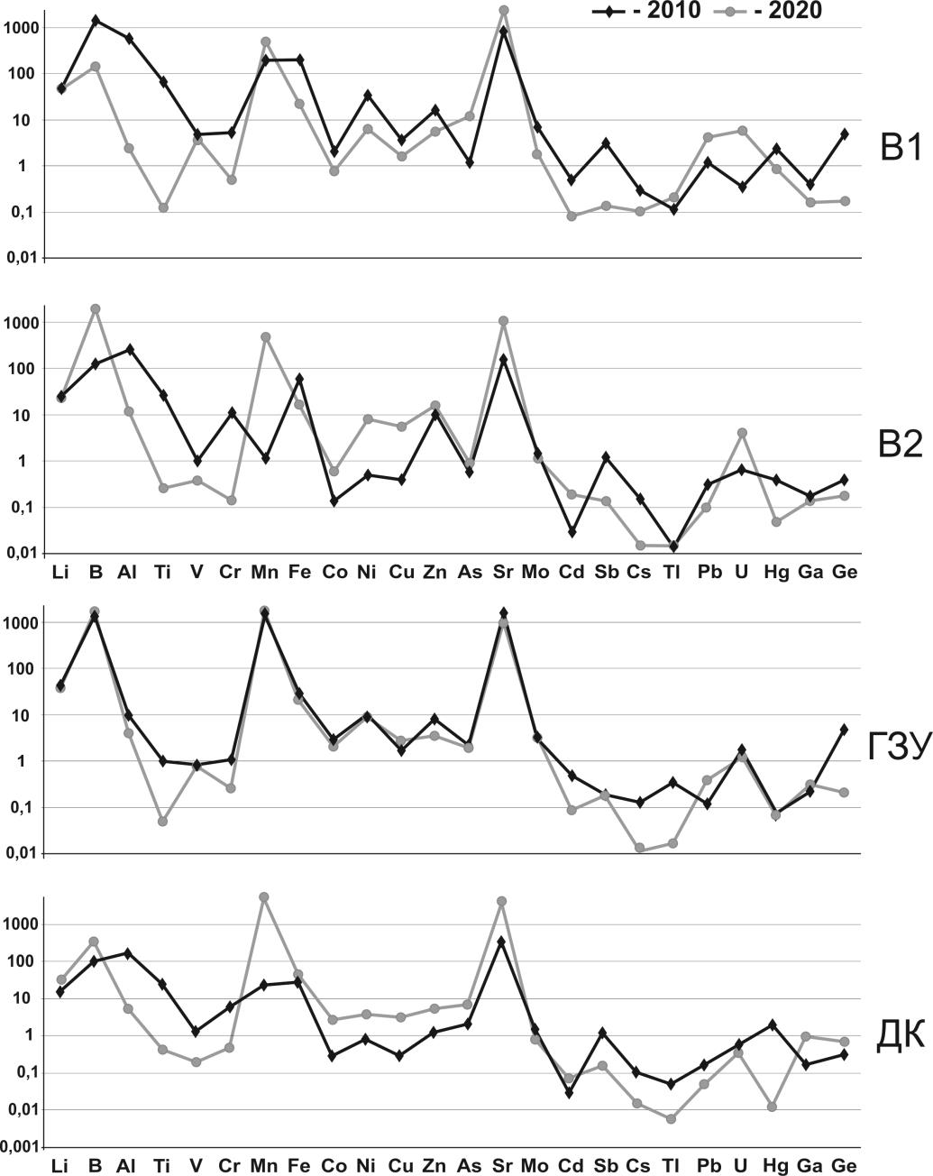 В разные по техногенной нагрузке периоды, наряду с изменением соотношения концентраций главных ионов в водах В1, происходит трансформация его микроэлементного состава. В 2010 г. сточные воды характеризуются максимальными для всех промышленных выпусков концентрациями Li, В, Al, Ti, V, Mn, Fe, Co, Ni, Cu, Zn, Mo, Sr, Cd, Sb, Cs, Tl, Pb, Ga и Ge (рис. 3). Сравнение с ПДК, установленными для водных объектов питьевого водоснабжения (ПДКпв) и рыбохозяйственного (ПДКрбх) значения, показало, что концентрации микроэлементов, за исключением Cr, Co, As, Cd, Cs, Pb и U, превышают величины нормативных показателей. В большей степени это относится к Hg (5ПДКпв и 239 ПДКрбх), Mn (2 ПДКпв и 20 ПДКрбх), Al (3 ПДКпв и 15 ПДКрбх), B (3 ПДКпв и 14 ПДКрбх), Mo (7 ПДКрбх), Sb (6 ПДКпв), V (5 ПДКрбх), Cu (4 ПДКрбх) и Ni (2 ПДКпв и 3 ПДКрбх). В период спада техногенной нагрузки (2020 г.) концентрации большинства микроэлементов (рис. 3) ниже уровня ПДК. Вместе с этим выделяются концентрации Mn (5 ПДКпв и 50 ПДКрбх), Sr (6 ПДКрбх), As (1 ПДКпв) и U (увеличение в 17 раз, по сравнению с 2010 г.), которые, напротив, значительно возросли.