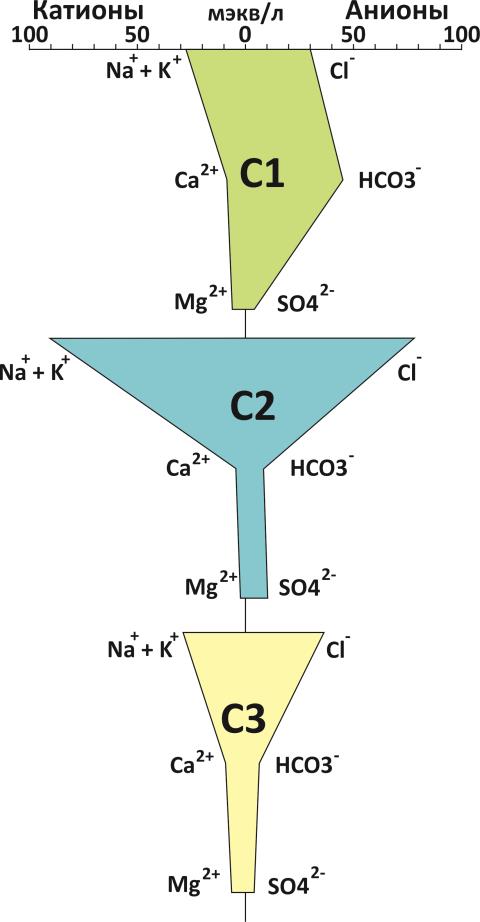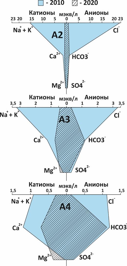 В 2010 г. воды А3 и А4 характеризовались HCO3–Cl–Ca–Na и Cl–HCO3–Na–Ca составом, соответственно, с повышенными относительного А1 величинами минерализации (309 и 169 мг/л, соответственно). В 2020 г. количество растворенных веществ в водах А3 (121 мг/л) и А4 (107 мг/л) ниже, основной ионный состав изменился на HCO3–Mg–Ca (рис. 6).