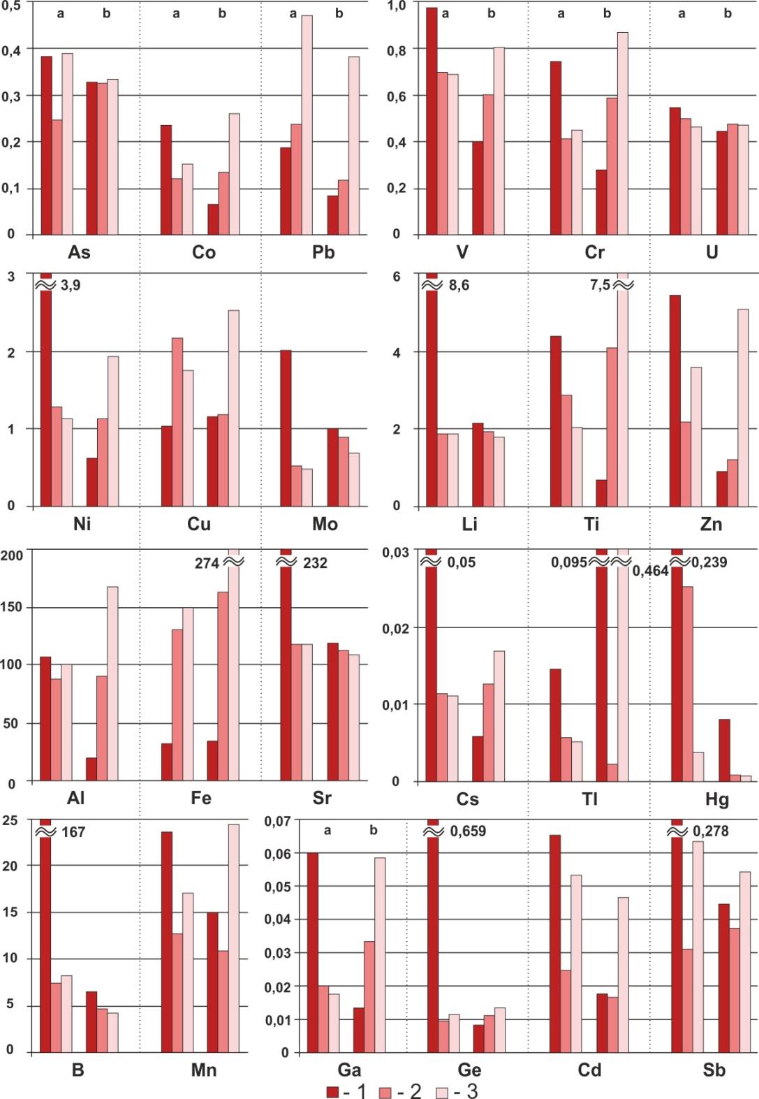 Канава ГЗУ Ash removal ditch | >1000 100–1000 50–99 10–49 2–9 | – Ge, Mn, B Tl Hg, Co, Li, Cs, Cd, Ga, Ni, Sr As, Zn, Mo, Sb, Cr, U, V | – B, Mn Hg, Co Ga, Ge, Li, Ni Sr, As, Sb, Cs, Pb, U, Cu, Mo, Cd, V, Zn, Tl |