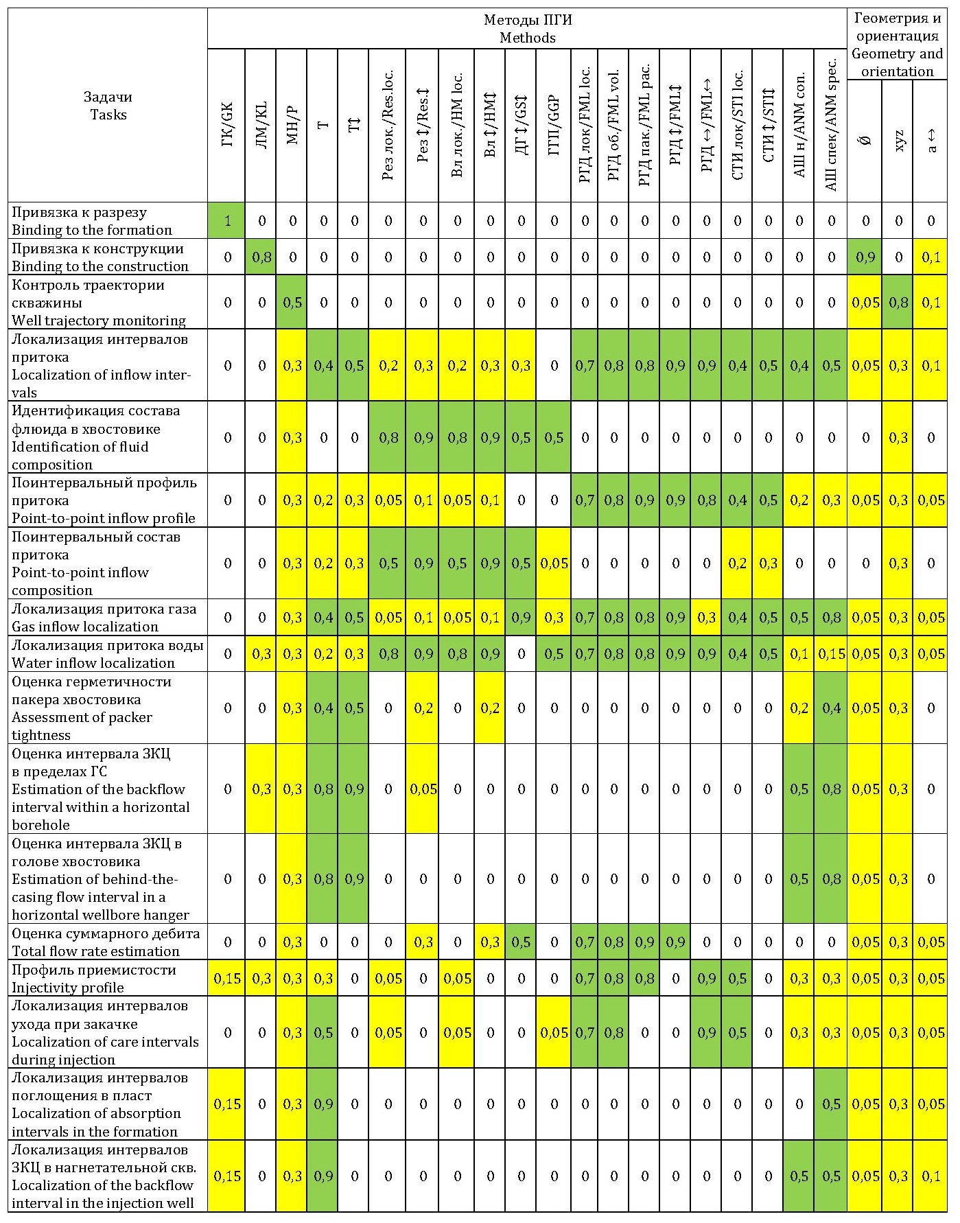 В табл. 1 представлен сравнительный рейтинг применимости методов ПГИ в зависимости от типа решаемой задачи. Каждому методу ставится в соответствие число в интервале от нуля до 1 в зависимости от того, насколько он является информативным при решении конкретной задачи (если, к примеру, информативность 0,9 – это означает, что 90 замеров из 100 будут соответствовать истинным значениям). Все методы разделены на три группы с помощью цветовой палитры: методы, которые являются основными при проведении исследований, выделены зеленым цветом, вспомогательные методы выделены желтым цветом, наконец, методы, которые неинформативны и имеют нулевой рейтинг, цветом не выделяются. Табл. 1 не позволяет определить суммарный рейтинг приборного комплекса ПГИ (потому что рейтинги отдельных методов не складываются), но помогает отсечь заведомо неинформативные или малоинформативные методы ПГИ и качественно сравнить информативность нескольких приборных связок при решении конкретной задачи.