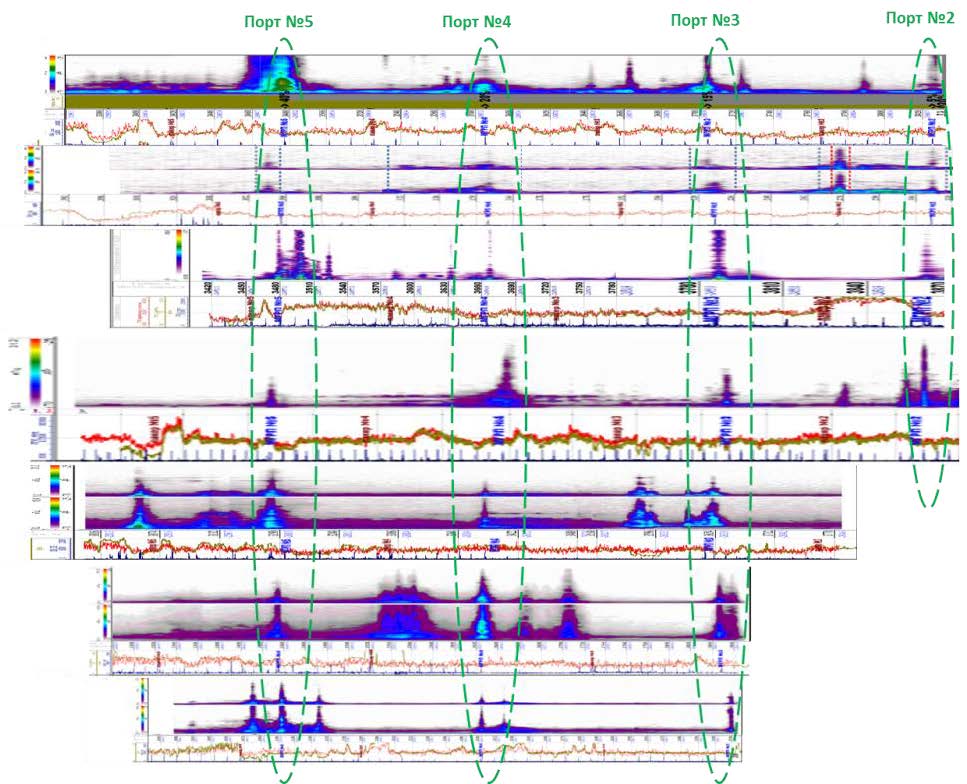 Рисунок. Акустические аномалии в интервалах портов МГРП с продольными трещинами