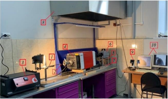 Fig. 1. Scheme of an experimental stand for studying ignition of coal fuel particles [21, 22]: 1 – stand for the holder; 2 – metal holder of fuel particles; 3 – control panel; 4 – high-temperature furnace; 5 – platform; 6 – high-speed video camera; 7 – guides; 8 – air exchange system; 9 – microscope; 10 – computer