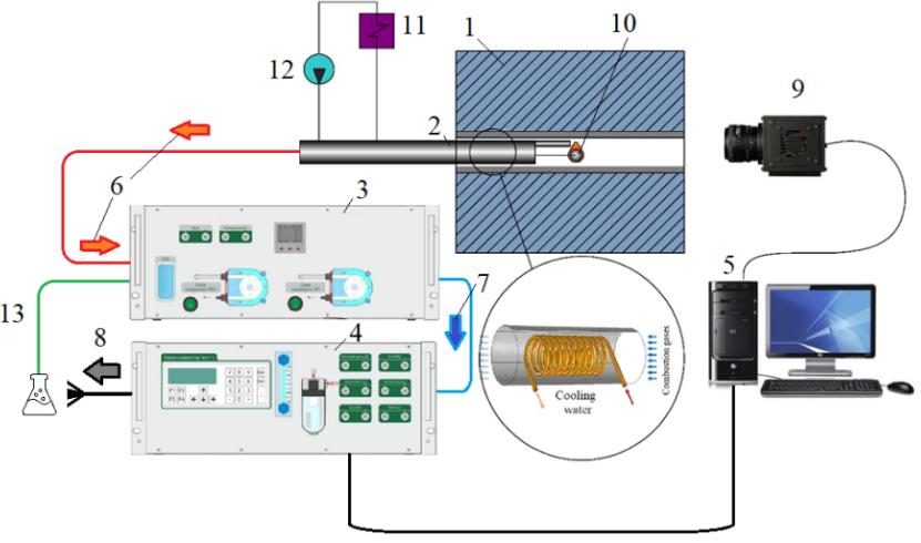 Рис. 2. Схема экспериментального стенда для анализа компонентного состава газообразных продуктов сгорания частиц угля [22]: 1 – высокотемпературная печь; 2 – пробоотборник с водяным охлаждением; 3 – охладитель-осушитель пробы; 4 – газоанализатор; 5 – компьютер; 6 – проба, прошедшая первый этап охлаждения; 7 – высушенный образец; 8 – газоанализатор; 9 – высокоскоростная видеокамера; 10 – частица угля; 11 – внешний теплообменник; 12 – насос; 13 – канал отвода конденсата из блока «охладитель–осушитель» образца. Позиции 11, 12 представляют систему циркуляционного водяного охлаждения пробоотборника