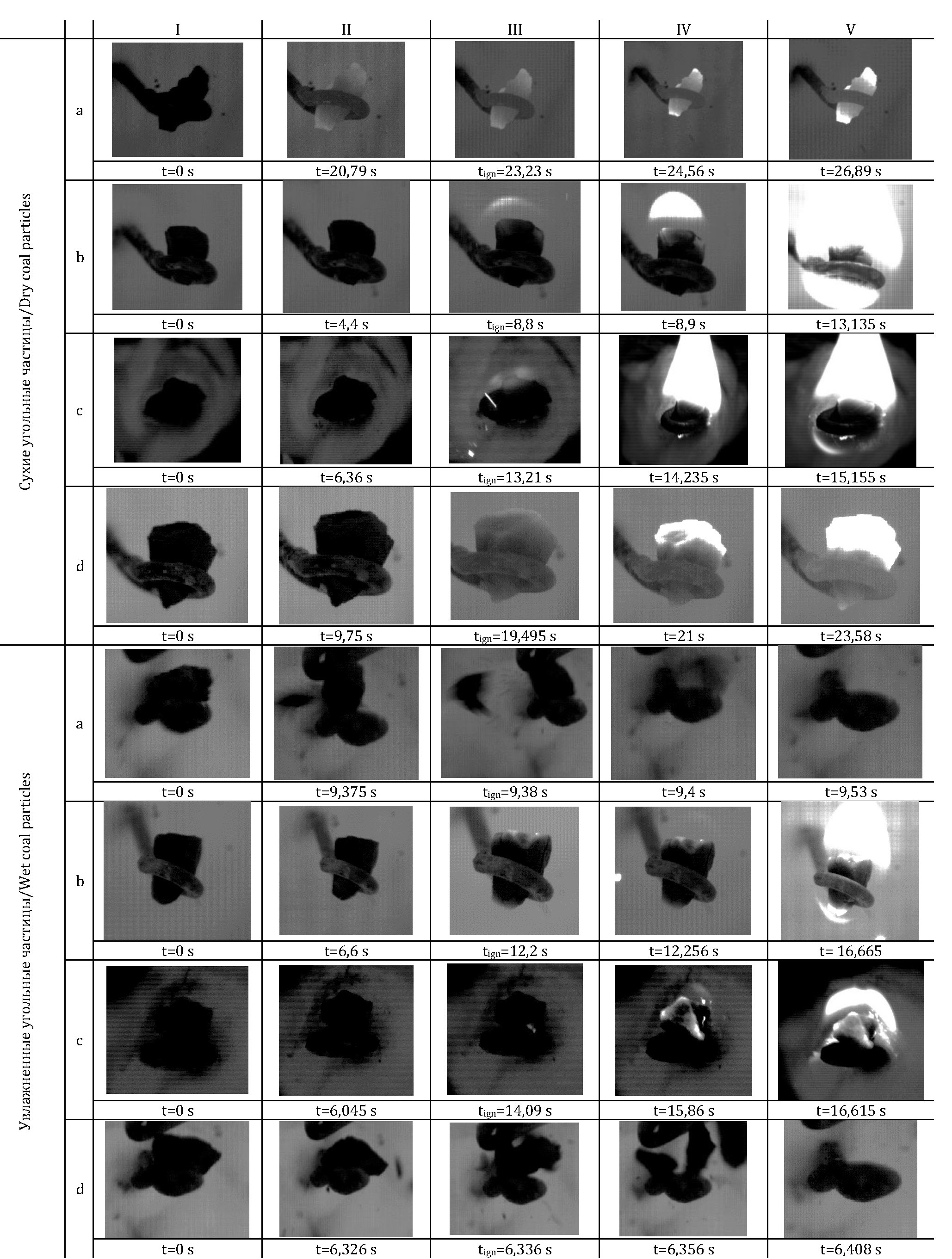 На рис. 3 приведены кадры типичных видеограмм процесса воспламенения сухих и увлажненных угольных частиц четырёх марок при температуре окружающей среды Tg=1073 К. Как показывают эксперименты, процесс термической подготовки, зажигания и горения сухих и увлажненных частиц бурого и длиннопламенного (рис. 3, b, с) углей характеризует газофазное зажигание. Скорее всего, это связано с большим количеством летучих, которые прогреваются быстрее, достигая температуры горения, и начинают гореть раньше углерода частицы. Можно отметить, что зона воспламенения локализована в верхней полусфере частицы, которая по своим размерам, как правило, превышает размер самой частицы. Для сухих частиц антрацита и тощего угля (рис. 3, a, d) характерно гетерогенное зажигание. Также стоит отметить, что увлажненные частицы антрацита и тощего угля (рис. 3, b, III, с, III) при высокотемпературном нагревании (при Tg≥1073 К) диспергируются на множество мелких фрагментов до момента зажигания, в отличие от сухих частиц угля той же марки.