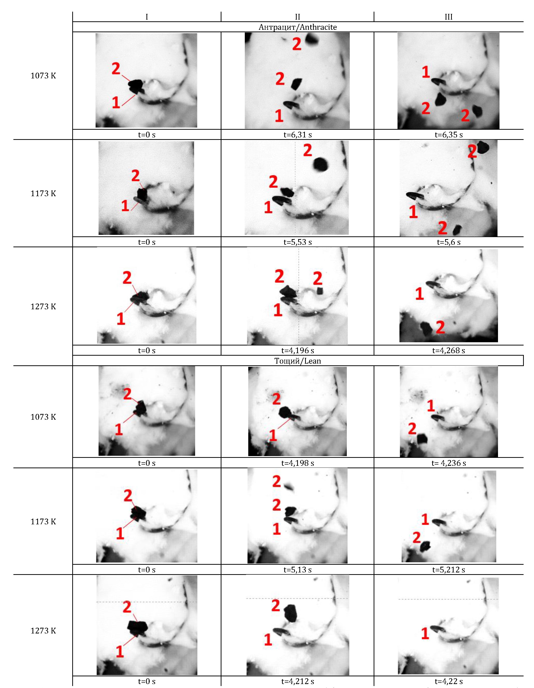 На рис. 4 приведены типичные кадры видеограмм процесса диспергирования увлажненных частиц угля двух марок: тощего и антрацит, для трех температур окружающей среды: 1070, 1173 и 1273 К. На кадрах хорошо видно, что в определенный момент времени (рис. 4, II) угольная частица за счет летучих слетает с держателя и, как правило, разрушается на 2–3 неравные части. После этого частицы с характерным размером от 0,3 до 1 мм зажигаются вблизи нижней стенки камеры сгорания.