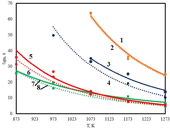 Для установления достоверных значений времен задержки зажигания число экспериментов составляло не менее 15 в идентичных условиях нагрева. Обработка результатов проводилась с использованием современного аппарата статистической обработки результатов эксперимента. Значение случайной погрешности составляло менее 10 %. Обработка полученных результатов осуществлялась по аналогии [30].