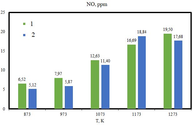На рис. 6 приведена гистограмма, характеризующая среднее (по времени горения) значение концентраций одного из основных антропогенных газов – оксида азота (NO) – в продуктах сгорания одиночных частиц сухого и влажного длиннопламенного угля. Хорошо видно, что даже незначительное увлажнение сухой частицы длиннопламенного угля (таблица) – на 8,24 % – приводит к существенному снижению оксида азота в продуктах сгорания топливных частиц. Так, при температуре окислителя Tg=973 К концентрация NOx в продуктах сгорания увлажненной частицы меньше на 26 % по сравнению с сухой частицей длиннопламенного угля.