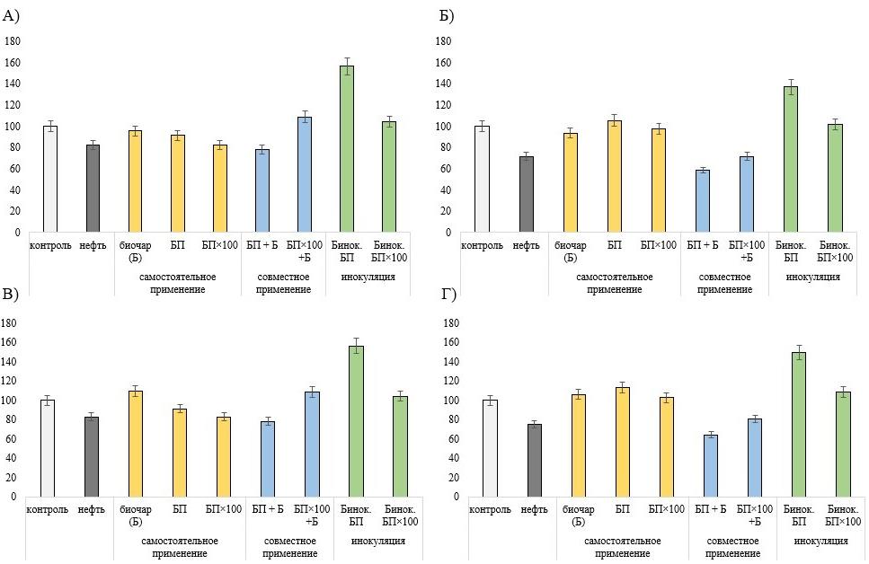 Fig. 2. Change in the intensity of development of barley seeds on oil contaminated Haplic Chernozem after introduction of biochar and Bacillus & Paenibacillus (n=6), % of the control: A) length of shoots; Б) length of roots; В) phytomass of shoots; Г) phytomass of roots