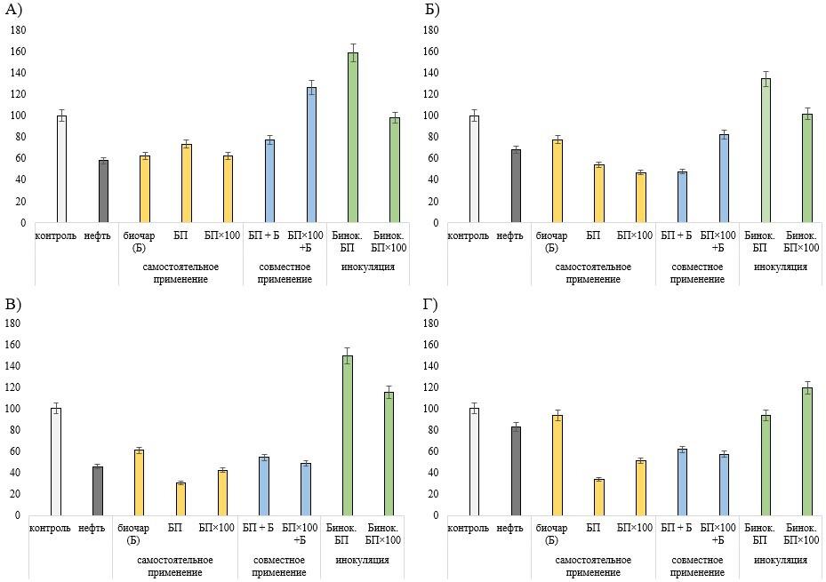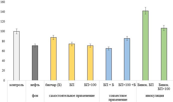 Совместное применение биочара и БП вызвало повышение длины побегов и корней (только при биочар+БП×100) на 14–68 % относительно нефтезагрязненного фона. Инокуляция на биочаре БП привела к повышению длины и массы побегов на 40–103 %, длины и массы корней – на 11–66 % относительно нефтезагрязнения.
