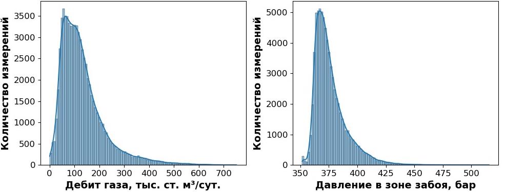 Распределение давления и дебита газа представлено на рис. 1. Статистика оценена с помощью межквартильного размаха и стандартного отклонения. Распределение дебита показывает большой разбег между максимальным и минимальным значениями. Отношение максимального значения дебита к минимальному составляет 5,65. Процентилий 75 % и максимальное значение различаются в разы. Распределения дебита газа и давления в зоне забоя представляют собой ассиметричные распределения со смещением влево. Коэффициент вариации (std/mean) равняется 0,68, что говорит о низкой дисперсии распределения.