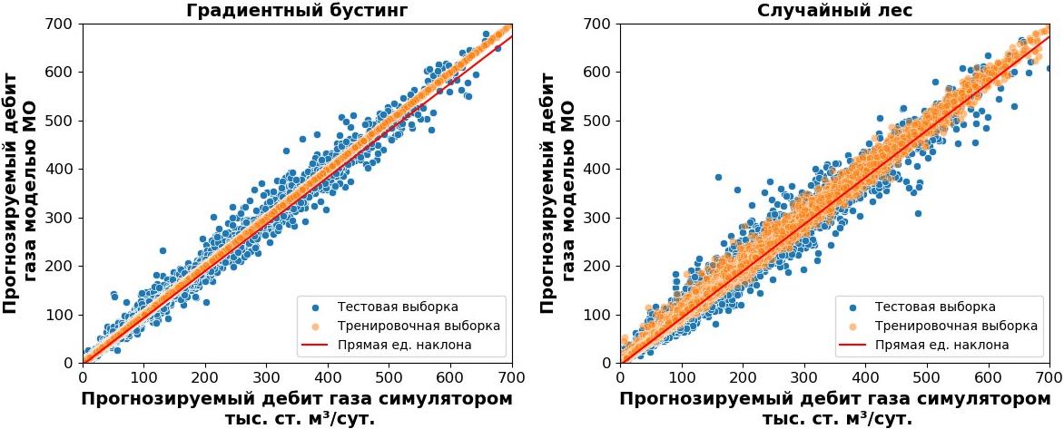 Кросс плот дебита газа, прогнозируемого симулятором и моделью машинного обучения, представлен на рис. 5. На данном рисунке показана работа модели как на тренировочной выборке, так и на тестовой. Сосредоточение большинства точек данных вблизи линии с наклоном 1 для обучающих и тестовых данных указывает на то, что модель ГБ обеспечивает более эффективное прогнозирования по сравнению с моделью случайного леса.