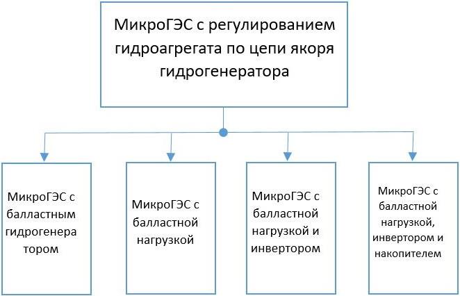 Рис. 2. Классификация систем генерирования и стабилизации напряжения микро-ГЭС по цепи якоря гидрогенератора