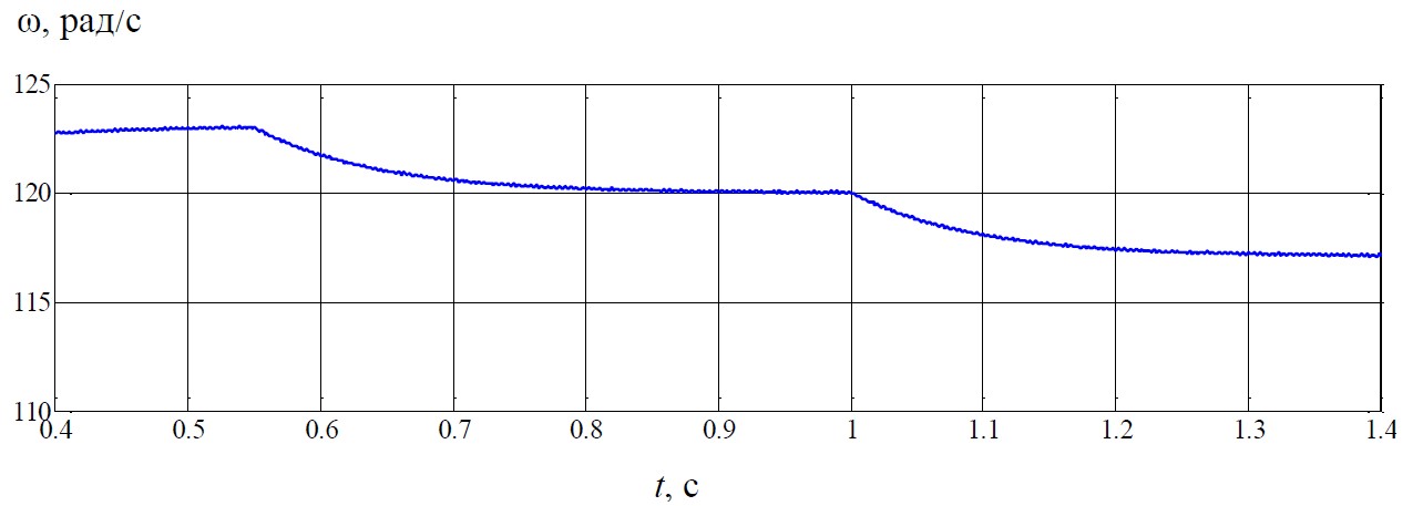 На рис. 7 представлены результаты моделирования в виде зависимости скорости вращения гидроагрегата от изменения мощности балластной нагрузки микро-ГЭС. До момента времени, равного 0,55 с, гидрогенератор работал на активный балласт мощностью, равной 80 % от Pнгг, затем в моменты времени 0,55 и 1 с мощность балласта увеличивалась на 0,1Pнгг.