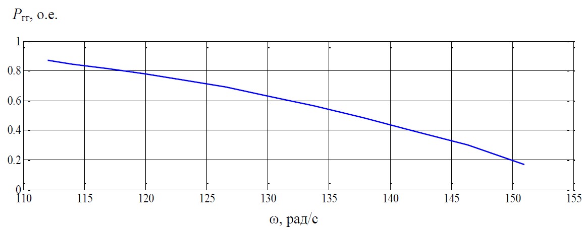 Fig. 8. Dependence of the angular rotation speed of the hydrogenerator on active load power