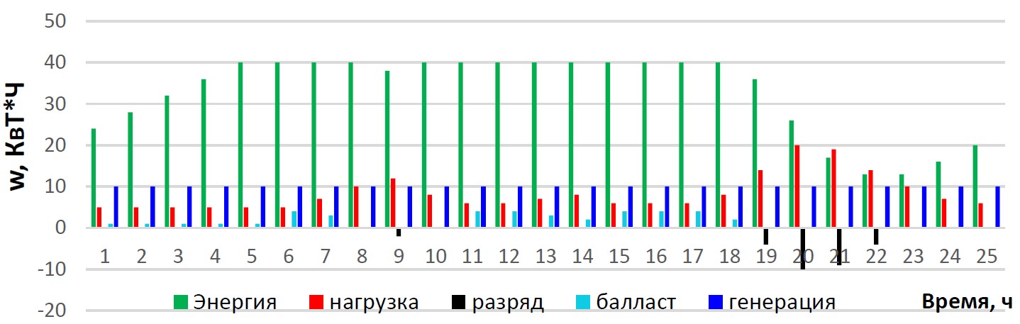 Результаты моделирования суточных энергетических балансов автономной системы электроснабжения с рассматриваемой инверторной микро-ГЭС в графическом виде приведены на рис. 12. На данном графике видны почасовые изменения суточного энергетического баланса, включающего энергию нагрузки, энергию заряда и разряда аккумуляторных батарей, энергию, преобразуемую в тепло на резистивном балласте и энергию гидрогенерации.