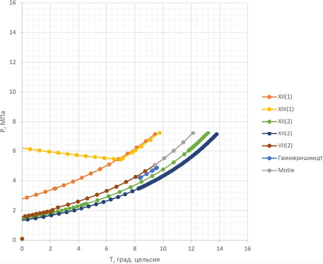 Из рис. 9 видно, что присутствуют два участка кривых гидратов, построенных по зависимостям Motie и Makagon. Первая зависимость даёт минимальное отклонение, и для упрощения расчётов (в случаях с не сернистым газом) можно пользоваться ей. Вторая зависимость является более старой и простой корреляцией. Кривые показывают термобарические условия, при которых гидрат находится в равновесном состоянии [27–29]. Область, которая находится левее, – там гидрат не будет образовываться, область правее – гидраты могут существовать в стабильном состоянии.