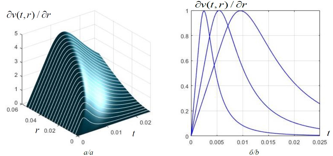 Рис. 2. Дифференциальное распределение скорости частиц по времени и по радиусу v(t,r): а) пространственное дифференциальное распределение скорости частиц по времени и радиусу; б) нормированное дифференциальное распределение скорости частиц во времени при фиксированном радиусе. График дифференциального распределения скорости частиц при фиксированном радиусе делится на максимальную величину распределения