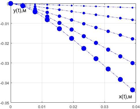 Fig. 3. Trajectories of globules with different radii. Along the vertical axis is the coordinate y(t), along the horizontal axis is the coordinate x(t). From top to bottom, graphs are presented for particles with radii r, 2r, 3r, 4r, 5r