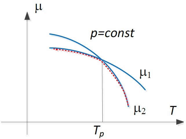 Fig. 5. Isobar. Chemical potential of phases at constant pressure. The slope on the graphs means entropy S=(∂μ/∂T)p. Entropy increases abruptly