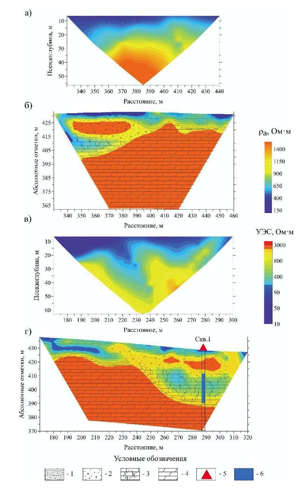 Fig. 3. Section of survey line 3: a) observed apparent resistivity data; б) electrical resistivity; section of survey line 4: в) observed apparent resistivity data; г) electrical resistivity. 1 – fine detrital loamy sands/loams; 2 – large detrital loamy sands/boulder gravels; 3 – fissured limestones; 4 – dense dolomites; 5 – hydrogeological well projection; 6 – watered layer selected based on geophysical well logging data