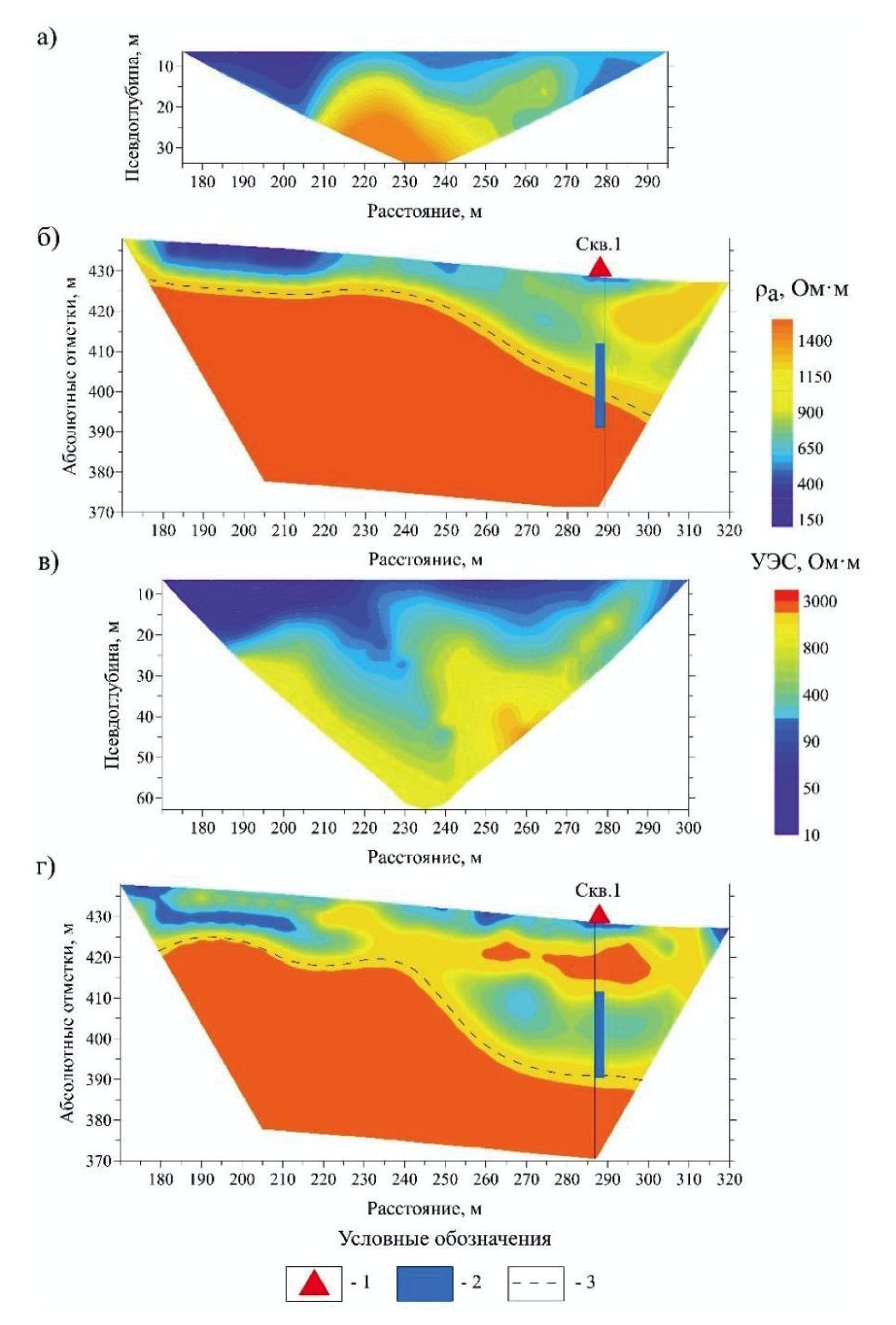 Fig. 4. Section of survey line 4: a) observed apparent resistivity data (Schlumberger array); б) electrical resistivity (Schlumberger array); в) observed apparent resistivity data (three-electrode array); г) electrical resistivity (three-electrode array). 1 – hydrogeological well; 2 – watered layer selected based on geophysical well logging data; 3 – dolomite stratum surface (roof)