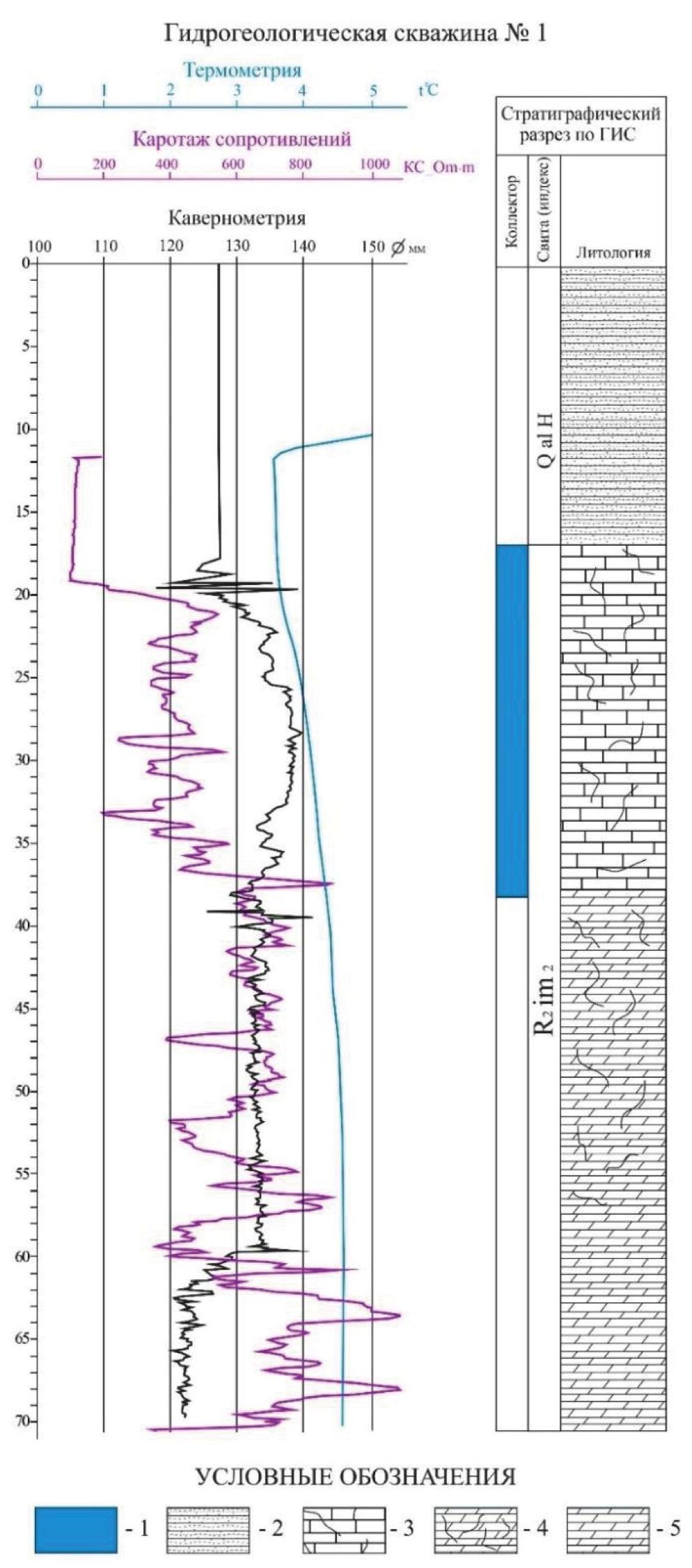 Fig. 5. Summary panel for well No. 1: 1 – wet strata; 2 – quaternary deposits; 3 – fissured limestones; 4 – fissured dolomites; 5 – dense dolomites