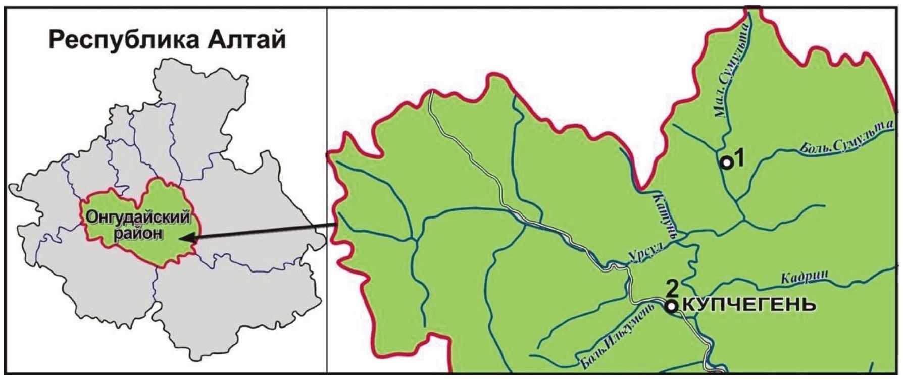 Рис. 1. Места добычи диких и домашних животных на территории Онгудайского района Республики Алтай с целью отбора проб органов и тканей: 1 – место добычи марала и дикого кабана; 2 – место отбора проб от домашней свиньи
