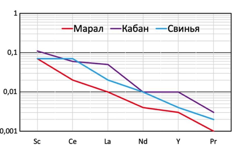 В организме алтайского марала, кабана и домашней свиньи наивысшими медианными значениями обладают среди макроэлементов – S, Cl и K; среди неметаллов – Br и I; среди тяжелых металлов – Pb и Hg; среди радиоактивных – Th; среди редкоземельных – Sc, Ce, La, Nd, Y и Pr. При этом концентрация РЗЭ в организме свиней оказалась выше, чем в организме марала, а максимальные содержания РЗЭ тяжелой подгруппы выявлены в организме свиньи домашней из села, расположенного в пределах гранитного массива, причем на реке, в бассейне которой значительные площади заняты кислыми магматическими породами, в том числе щелочными гранитами.