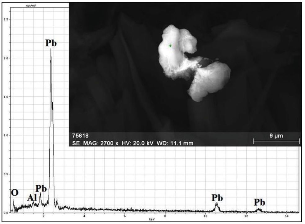 Рис. 4. Электронно-микроскопическое изображение в обратно рассеянных электронах и энергодисперсионный спектр Pb-содержащей частицы в головном мозге домашней свиньи из села Купчегень