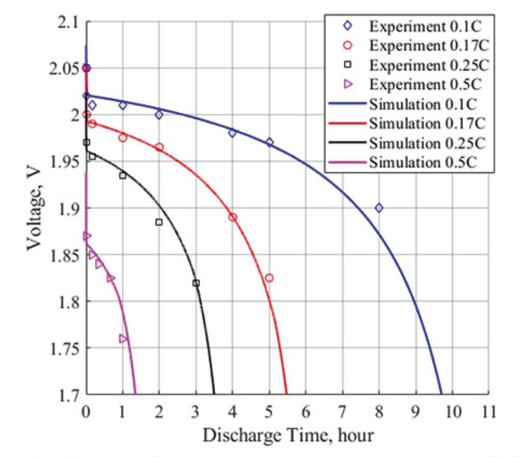 На рис. 5 представлены результаты моделирования статических разрядных характеристик АКБ OPzS 2V200Ah при разных значениях разрядного тока, которые выражены в долях от величины номинальной емкости С для 10-ти часового режима разряда. Маркерами на рис. 5 показаны экспериментальные точки разрядных кривых, а линиями – результаты моделирования.