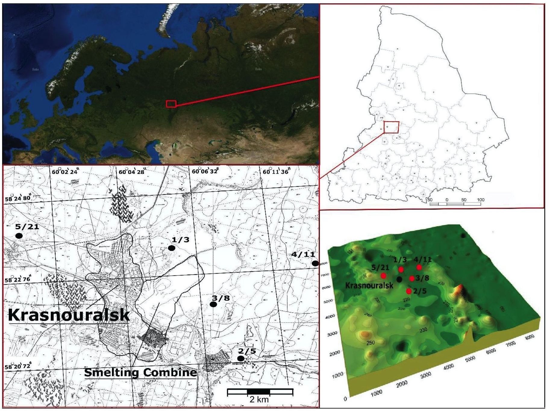 Для исследования концентрации мышьяка в ортштейнах была выбрана северо-таежная зона Свердловской области в районе г. Красноуральске (рис. 1), где с 1931 г. функционирует медеплавильный комбинат. В результате многолетней деятельности из-за нарушений рационального землепользования, отсутствия современных методов очистки отходящих газов прилегающие ландшафты претерпели сильное видоизменение с образованием больших площадей нарушенных, загрязненных земель [30].