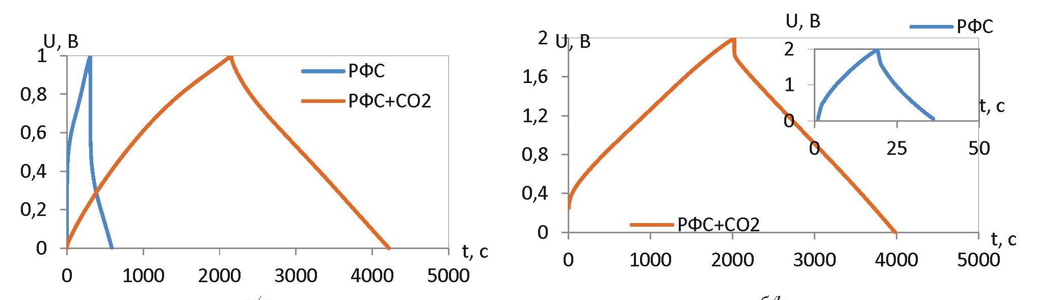 Гальваностатические кривые заряда-разряда получены при токах 1 мА/с и представлены на рис. 4, a, b для водного и органического электролитов. Можно отметить, что для кривых РФС+CO2 характерна практически треугольная форма кривой. Это подтверждает предположения о простой диффузии ионов электролита по порам образцов и высокой обратимости заряда электрода, обнаруженной по результатам циклической вольтамперометрии. Падение напряжения в водном электролите H2SO4, соответствующее величине последовательного сопротивления ячейки, составило 0,321 и 0,008 В для РФС и РФС+CO2 соответственно. Значения падения напряжения для этих же образцов в органическом электролите характеризуется величинами 0,368 и 0,138 В.