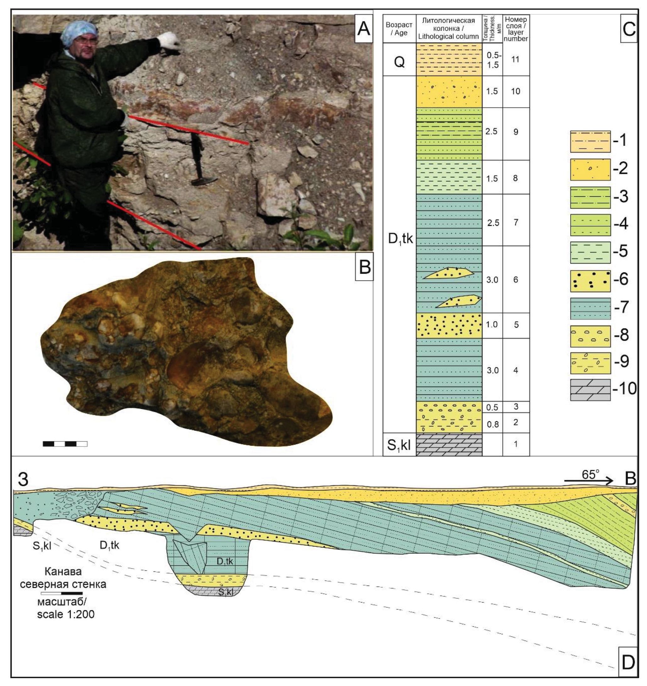 Fig. 2. «Sukhaya Volynka» section: A – photo of the outcrop of rocks on the surface, bazal layers of the Takata formation; B – lithified conglomerate of the Takata formation, layer 3; C – lithological column of the section; D – sketch of the section. Lithology symbols: 1 – deluvial clay with sand; 2 – sand with gravel and pebbles; 3 – interlayers of greenish siltstones; 4 – greenish sandstones; 5 – light green clay; 6 – gravel sand; 7 – light gray, fine-grained sandstones; 8 – light gray conglomerates, gravelstones, gravelite-sandstones; 9 – disintegrated conglomerates and gravelstones; 10 – light gray dolomites, finely crystalline